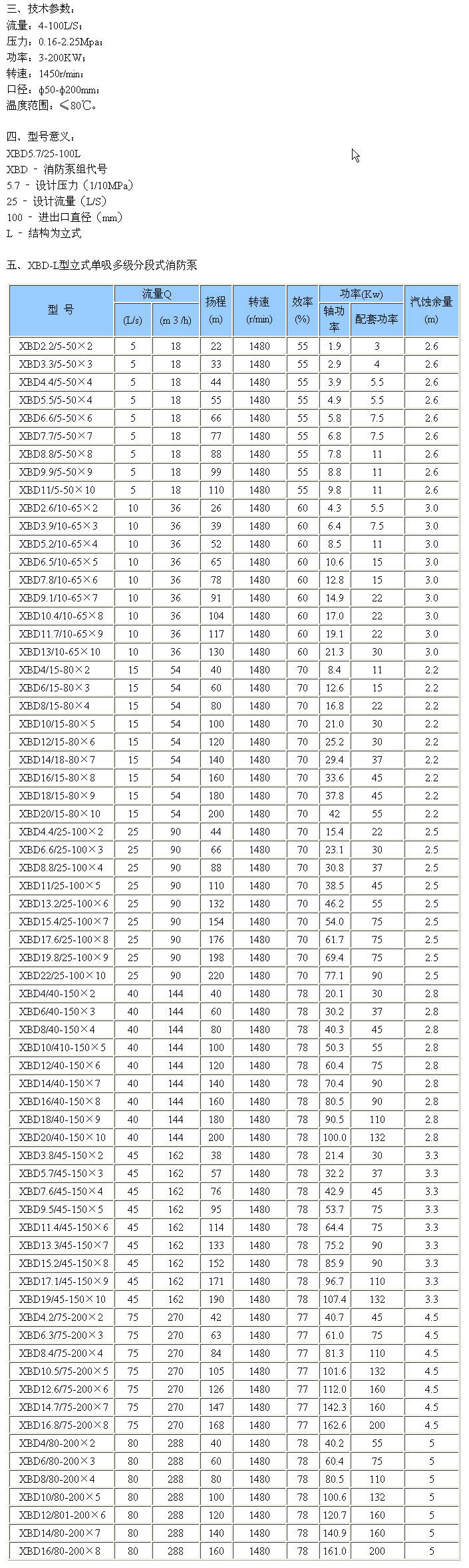 XBD-L型立式單吸多級分段式消防泵![]() XBD-L型立式單吸多級分段式消防泵 更多信息一、產品概述: XBD-L型立式單吸多級分段式消防泵組,供輸送不含固體顆粒的清水及物理化學性質類似于水的液體之用。主要用于消防系統(tǒng)管道增壓送水,也適用于工業(yè)和城市給排水,高層建筑增壓送水、運距離送水、采暖、浴室、鍋爐冷暖水循環(huán)增壓、空調制冷系統(tǒng)送水及設備配套等場合。 本公司生產的XBD-L型系列消防泵其性能、技術條件符合國家新頒布的GB6245-1998《消防泵性能要求和試驗方法》標準的要求,產品經國家消防裝備質量監(jiān)督檢測中心測試合格,獲得上海市消防產品認可證書。 二、產品特點: 1、泵機構緊湊、體積小、外形美觀,其立式機構決定安裝面積小,其重心重合于泵腳中心,因而增強了泵的運行穩(wěn)定性和使用壽命。 2、泵吸入口和吐出口均水平方向,簡化了管路的連接。 3、可根據需要,吸入口和吐出口可安裝成同方向或90°、180°、270°幾個不同方向以滿足不同的連接場合。 4、泵壓力可根據需要增減水泵級數并切割葉輪外徑予以滿足,而不改變安裝占地面積,這是其他泵類所不具有的。 5、泵轉子具有較小的繞度,運行平穩(wěn)、振動小、噪音低、使用壽命長。 |