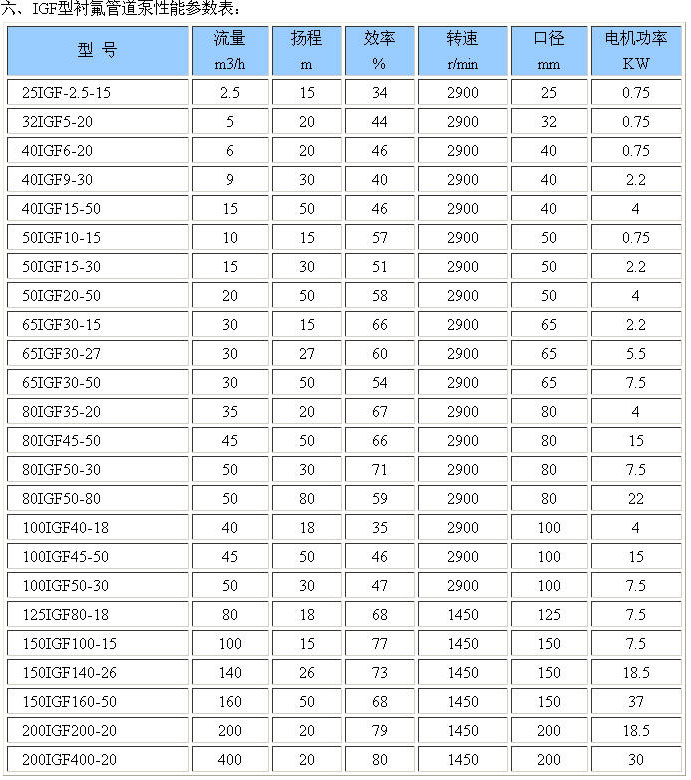 五、IGF型襯氟管道泵性能參數表: