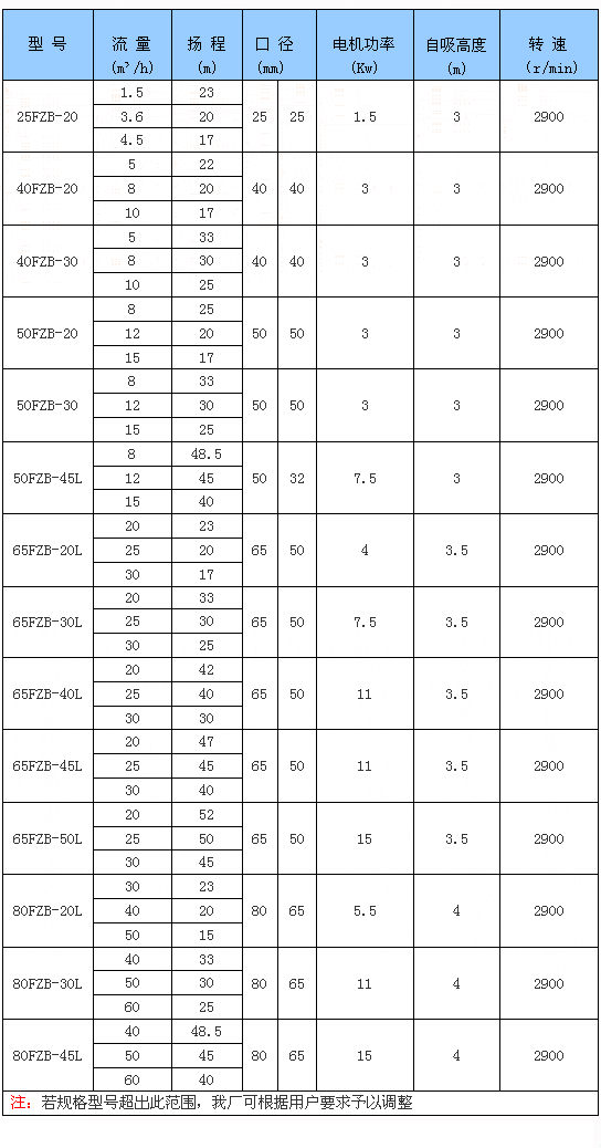 一、產品概述: FZB系列氟塑料自吸泵是按國際標準并結合非金屬泵的工藝設計制造。泵體采用金屬外殼內襯氟塑料,過流部件全部采用氟塑料合金制造,泵蓋、葉輪等均用金屬嵌件外包氟塑料整體燒結壓制而成,軸封采用外裝式 的波紋管機械密封,靜環選用99.9%氧化鋁陶瓷(或氮化硅),動環采用四氟填充材料,其耐腐耐磨密封性極好。泵的進出口均采用鑄鋼體加固,以增強了泵的耐壓性。實際使用顯示,該泵具有耐腐、耐磨、耐高溫、不老化、機械強度高、運轉平穩、結構 合理、密封性能嚴格可靠、拆卸檢修方便、使用壽命長等優點。 二、主要特點: FZB自吸泵最突出的特點就是具有自吸功能,可抽送低于泵安裝位置以下的液體,且性能穩定,操作簡單,只需在泵第一次使用前灌液后,第二次及以后使用則無需灌液,直接開機即可,自吸高度可根據介質密度在2至 三、主要用途: 四、技術參數: 流量:1.5~60m3/h; 揚程:15~50m; 轉速:2900r/min; 功率:1.5~15KW; 進口直徑:25~80mm; 適用溫度:-20℃~ 五、型號意義: 50 F Z B - 30 L ┬ ┬ ┬ ┬ ┬ ┬ │ │ │ │ │ └──長支架聯接 └─────────────—吸入口直徑(mm) 六、FZB系列氟塑料自吸泵性能參數: