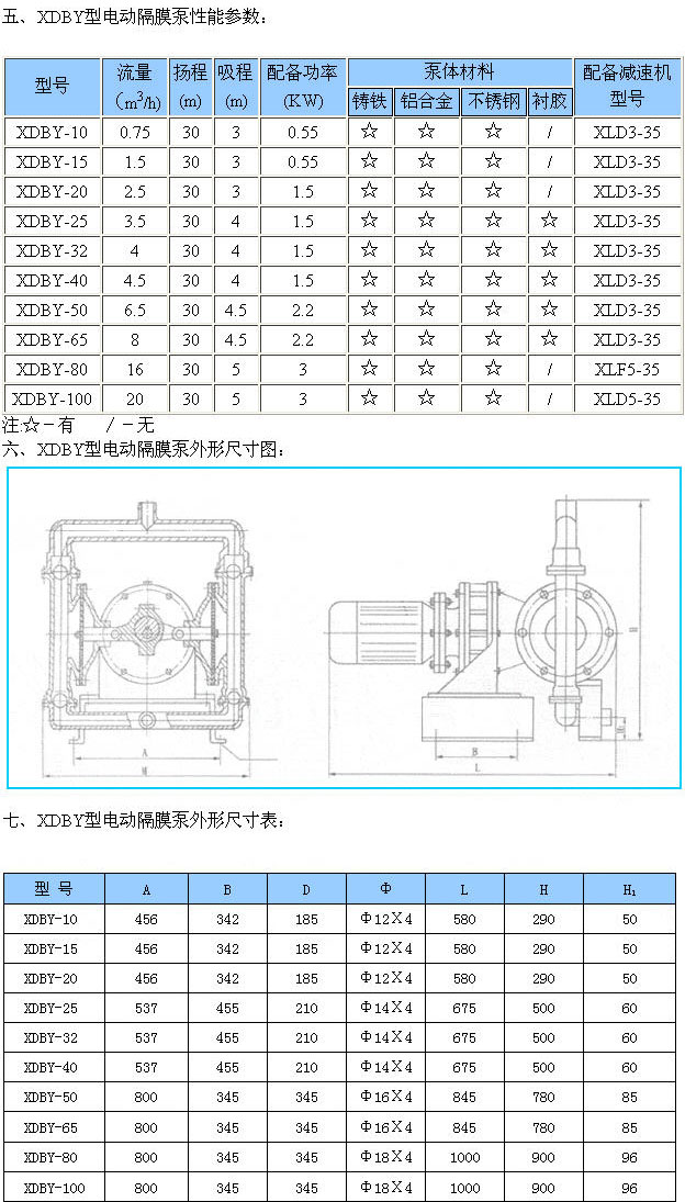 XDBY型電動隔膜泵![]() XDBY型電動隔膜泵 更多信息一、產品概述: 新研制開發的XDBY型電動隔膜泵,采用XLD系列擺線針輪減速機傳動動力,電動隔膜泵是一種 的泵類,近年來,由于在隔膜材質上取得了突破性的進展,國際上越來越多的工業化國家采用此種型式的泵,取代部份離心泵、螺桿泵,來應用于石化、陶瓷、冶金等行業,產品設計均參考美國ABEL公司樣機,該泵適用于低壓,即出口壓力≤3kgf/cm2的場合。 二、主要用途: 1、各種劇毒、易燃、易揮發液體。 2、各種強酸、強堿、強腐蝕液體。 3、可輸送較高溫度的介質 4、作為各種壓濾機前級送壓裝置。. 5、熱水回收及循環。 6、油罐車、油庫、油品裝卸。 7、泵吸泡菜果醬、土豆泥、巧克力等。 8、泵吸油漆、樹膠、顏料粘合劑。 9、各種瓷器釉漿水泥灌漿灰漿泥漿。 10、各種橡膠漿乳膠、有機溶劑、填料。 11、用泵為油輪駁船清倉吸取倉內污水及剩油。 12、啤酒花及發酵粉稀漿、糖漿、糖蜜。 13、泵吸礦井、坑道、隧道、下水道中污水、沉淀物。 14、各種特殊介質的吸送。 三、技術參數: 流量:0 揚程: 功率:0.37-4kw; 轉速:1450r/min; 口徑:10 溫度:-15-+ 自吸高度:5 四、型號意義: XDBY – 40 XDBY - 電動隔膜泵; 40 - 進出口直徑(mm) |