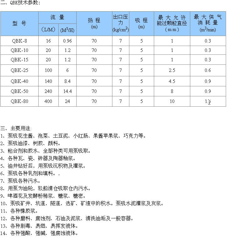 QBK型氣動隔膜泵一、產品概述: QBK氣動隔膜泵是第三代氣動隔膜泵,具有使用壽命長,不會停頓等優點,它既能抽送流動的液體,又能輸送一些不易流動的介質,具有自吸泵、潛水泵、屏蔽泵、泥漿泵和雜質泵等輸送機械的許多優點。 1、不需灌引水.吸程高達 2、流動寬敞,通過性能好.允許通過最大顆粒直徑達 3、揚程、流量可通過氣閥開度實現無級調節(氣壓調節在1— 4、該泵無旋轉部件,沒有軸封,隔膜等抽送的介質與泵的運動部件、工件介質完全隔開,所輸送的介質不會向外泄漏。所以抽送有毒、易發揮或腐蝕性介質時,不會造成環境污染和危害人身安全; 5、不必用電.在易燃、易爆場所使用 ; 6、可以浸沒在介質中工作: 7、使用方便、工作可靠、開停只需簡單地打開和關閉氣體閥門.即使由于意外情況而長時間無介質運行或突然停機泵也不會因此而損壞.一旦超負荷,泵會自地動停機,具有自我保護性能,當負荷恢復正常后,又能自動啟動運行; 8、結構簡單、易損件少,該泵結構簡單,安裝、維修方便,泵輸送的介質不會接觸到配氣閥,聯桿等運動部件,不象其他類型的泵因轉子、活塞、齒輪、葉片等部件的磨損而使性能逐步下降: 9、可輸送較粘的液體(粘度在1萬厘泊以下): 1 0、本泵無須用油潤滑,即使空轉.對泵也無任何影響,這是該泵最大特點。
