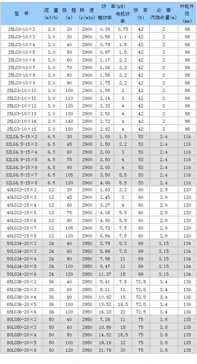 65 LG 36 - 20×6 65 – 泵進出口直徑(mm) LG – 立式多級分段式離心泵 36 – 泵設(shè)計流量(m3/h) 20 – 泵設(shè)計點單級揚程(m) 6 – 級數(shù) ![]() |