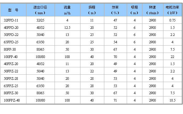 一、產(chǎn)品概述: FPZ耐腐蝕自吸離心泵,采用聚偏氟乙烯(PVDF)、增強(qiáng)聚丙烯(RPP)一次注塑成型。機(jī)械強(qiáng)度高,耐腐蝕性能強(qiáng),結(jié)構(gòu)上有獨(dú)具一格的科學(xué)性,泵腔內(nèi)設(shè)有吸液室、儲(chǔ)液室、回液止回室、氣液分離室、回流孔。只需在第一次開(kāi)機(jī)前灌注引液,以后不必重復(fù)灌注引液,吸入管安裝液下閥,工作時(shí)機(jī)械密封不需另加冷卻水冷卻,操作簡(jiǎn)便、安全無(wú)泄漏,是取代液下泵的 產(chǎn)品,適用于 三、FPZ耐腐蝕自吸離心泵性能參數(shù)表: