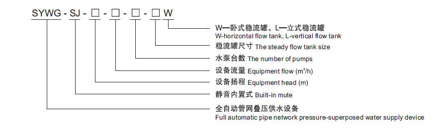 SYWG-SJ內(nèi)置水泵管網(wǎng)疊壓供水設(shè)備,由不銹鋼潛水泵(一般一臺至2臺),穩(wěn)流罐1個,罐上設(shè)有壓力傳感器、真空抑制器,不銹鋼止回閥、不銹鋼蝶閥(或球閥)、氣壓穩(wěn)壓罐、不銹鋼管路、變頻控制柜。