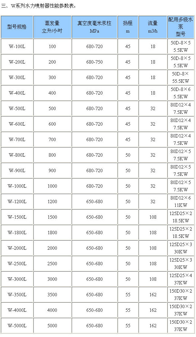 W系列污水提升設備(真空泵)一、產品概述: W系列污水提升設備是一種具有抽真空、冷凝、排水等三種有效能的機械裝置。它是利用一定壓力的水流通過對稱均布成一定傾斜度的噴咀噴出,聚合在一個焦點上。由于噴射水流速度很高,于是周圍形成負壓使器室內產生真空,另外由于二次蒸汽與噴射水流直接接觸,進行熱交換,絕大部分的蒸汽冷凝成水,小量未被凝的蒸汽與不疑結的氣體亦由于與高速噴射的水流互相摩擦, 混合與擠壓,通過擴壓管被排除,使器室內形成更高的真空。污水提升設備應用極為 ,主要用于真空與蒸發系統,進行真空抽水、真空蒸發、真空過 濾、真空結晶、干燥、脫臭等工藝,是制糖、制藥、化工、食品、制鹽、味 精、牛奶、發酵以及一些輕工、國防部分 需求的設備。(材質、不銹鋼、鑄鐵) 其工作性能,具有一定的 性,是真空冷凝設備的一種革新,深受各地用戶單位的歡迎。 二、結構與優點: