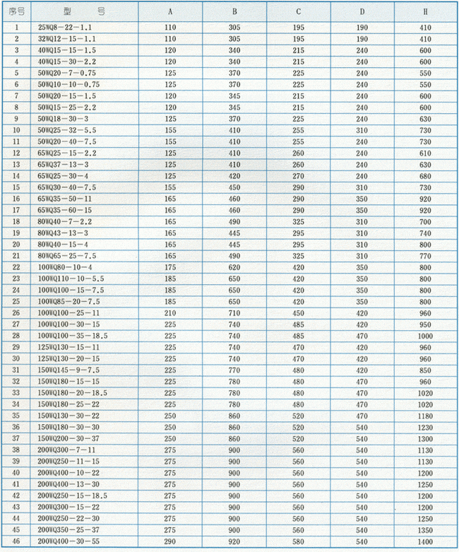 導航:回首頁---當前位置---水泵產品內容頁補充頁 >> WQ型無堵塞潛水排污泵外形安裝尺寸 |