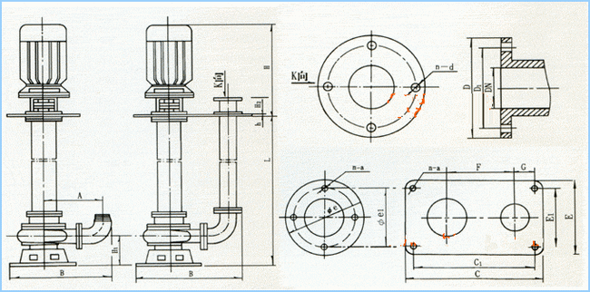 YW型無堵塞液下排污泵外形安裝尺寸圖: