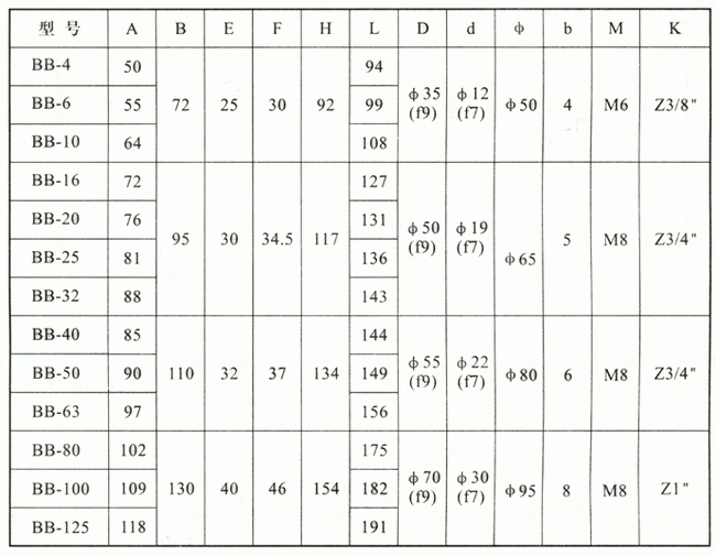 ![]() BB、BBG型內嚙合擺線齒輪泵外形尺寸表:
