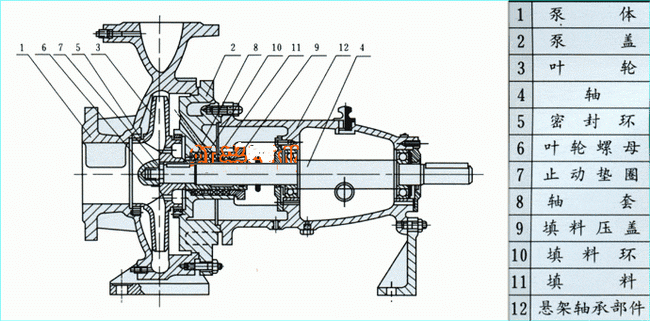 IS、IR型單級單吸離心|泵結構圖IS、IR型單級單吸離心泵結構說明: IS、IR型泵系根據國家標準ISO2858所規定的性能和尺寸設計的,主要由泵體(1)、泵蓋(2)、葉輪(3)、軸(4)、密封環(5)、軸套(8)及懸架軸承部件(12)等所組成。 IS、IR型泵的泵體和泵蓋的部分,是從葉輪背面處剖分的,即通常所說的后開門結構形式。其優點是檢修方便,檢修時不動泵體,吸入管路,排出管路和電動機,只需拆下加長聯軸器的中間聯接件,即可退出轉子部件,進行檢修。 泵的殼體(即泵體和泵蓋)構成泵的工作室、葉輪、軸和滾動軸承等為泵的轉子。懸架軸承部件支承著泵的轉子部件,滾動軸承承受泵的徑向力和軸向力。 為了平衡泵的軸向力,大多數泵的葉輪前、后均設有密封環,并在葉輪后蓋板上設有平衡孔,由于有些泵軸向力不大,葉輪背面未設密封環和平衡孔。 泵的軸向密封環是由填料壓蓋(9),填料環(10),和填料(11)等組成,以防止進氣或大量漏水。泵的葉輪如有平衡。則裝有軟填料的空腔與葉輪吸入口相通,若葉輪入口處液體處于真空狀態,則很容易沿著軸套表面進氣,故在填料腔內裝有填料環通過泵蓋上的小孔將泵室內壓力水引至填料環進行密封。泵的葉輪如沒有平衡孔,由于葉輪背面液體壓力大于大氣壓,因而不存在漏氣問題,故可不裝填料環。 為避免軸磨損,在軸通過填料腔的部位裝有軸套保護,軸套與軸之間裝有O形密封圈,以防止沿著配合表面進氣或漏水。 泵的傳動方式是通過加長彈性聯軸器與電動機聯結的。泵的旋轉方向,從驅動端看,為順時針方向旋轉。
