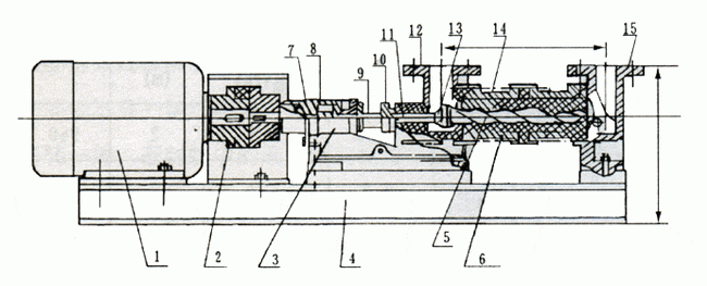 I-1B濃漿泵|結構圖說明I-1B濃漿泵結構圖說明:1、電機2、聯軸器3、軸承體4、電機機座5、螺桿軸6、橡膠套7、銷帽8、軸承9、空心軸10、填料壓蓋11、繞軸12、三通泵體13、銷帽14、直筒15、進口